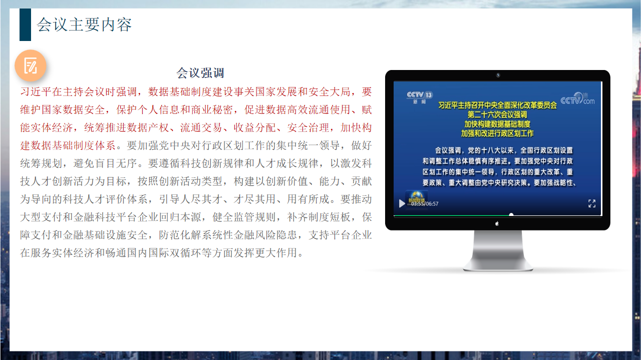 习近平在主持会议时强调,数据基础制度建设事关国家发展和安全大局,要维护国家数据安全,保护个人信息和商业秘密,促进数据高效流通使用、赋能实体经济,统筹推进数据产权、流通交易、收益分配、安全治理,加快构建数据基础制度体系。