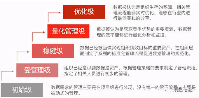 本标准将组织数据能力成熟度评价层级划分为五个等级: 初始级、受管理级、稳健级、量化管理级和优化级,如下图: