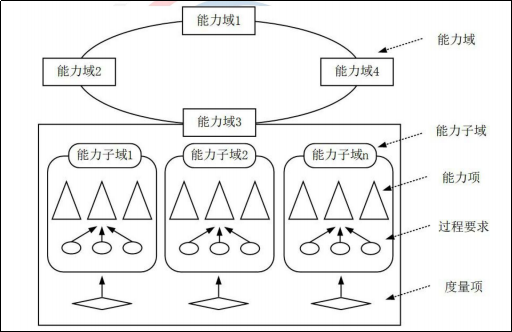 信息系统建设和服务能力从四个能力域体现,每个能力域包含若干个能力子域,每个能力子域包含若干个能力项,每个能力项对应若干条过程要求。过程要求是能力项建设的具体过程分解,作为组织建设信息系统和提供服务过程的指导,也可作为对组织信息系统建设和服务提过程进行评估的对象。度量项是对能力子域建设成效进行评估的维度。